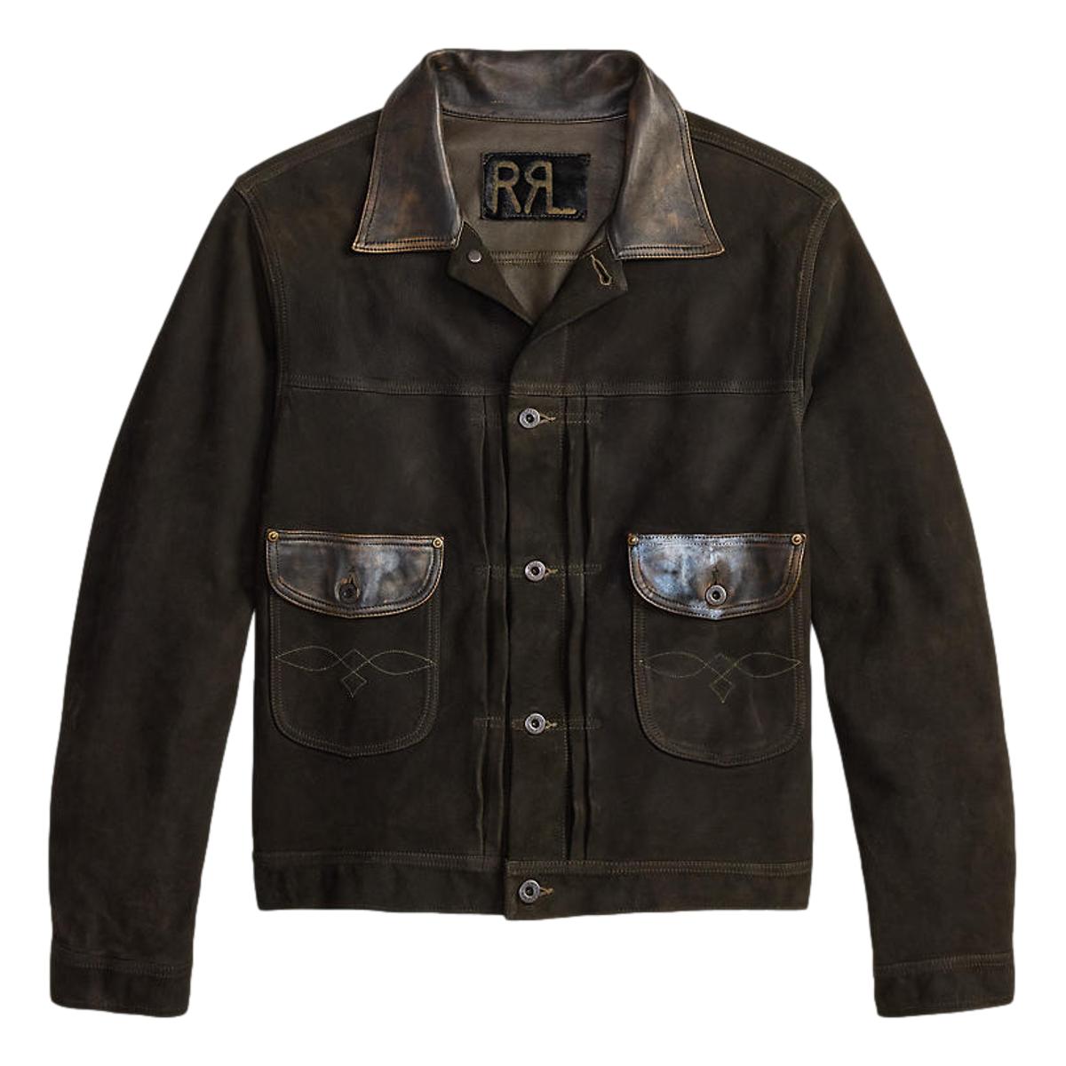 Made from roughout suede. Adjustable buckled tabs at the sides. American-made metal buttons. Lined at the yokes, the sleeves, and the waistband.