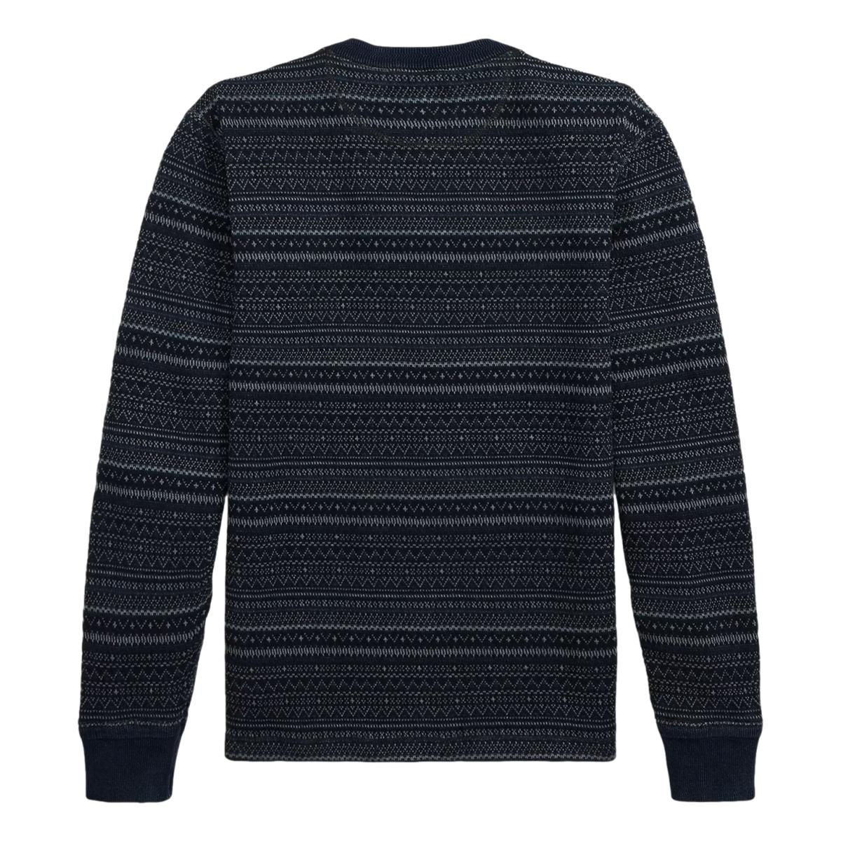 Made with cotton jacquard that is yarn-dyed with true indigo. Pattern and color are inspired by a vintage swatch. Woven placket facing. Ribbed trims. Washed for softness.