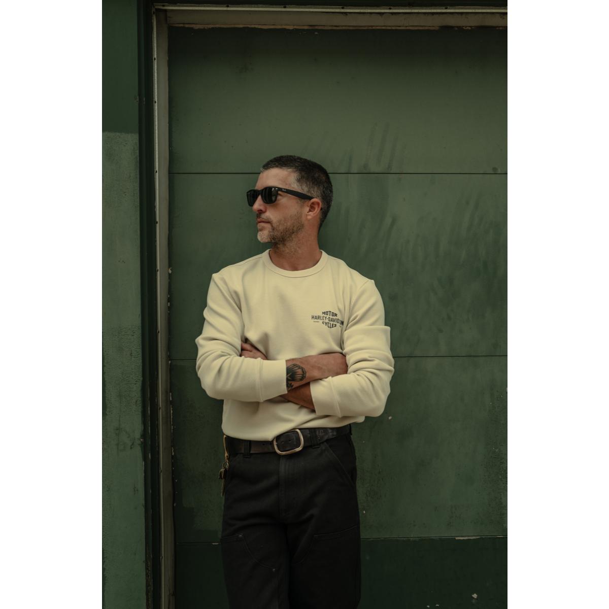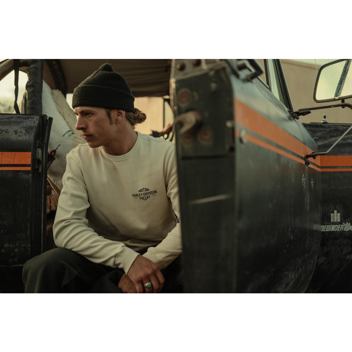 Enduring intersects with legendary in Harley-Davidson Originals Standard Issue Birdseye Thermal. Its relaxed fit is crafted from a rugged, 440-gram cut of cotton birdseye thermal for a textured look. It’s durable as a stand-alone or as a layering piece for added warmth. This men’s long sleeve thermal is distinctively dyed for a well-worn feel and features rib-knit trim to help keep its shape. Its understated look gets a hit of our exclusive H-D® Originals graphics that are inspired by their earliest Bar & Shield (circa 1910).