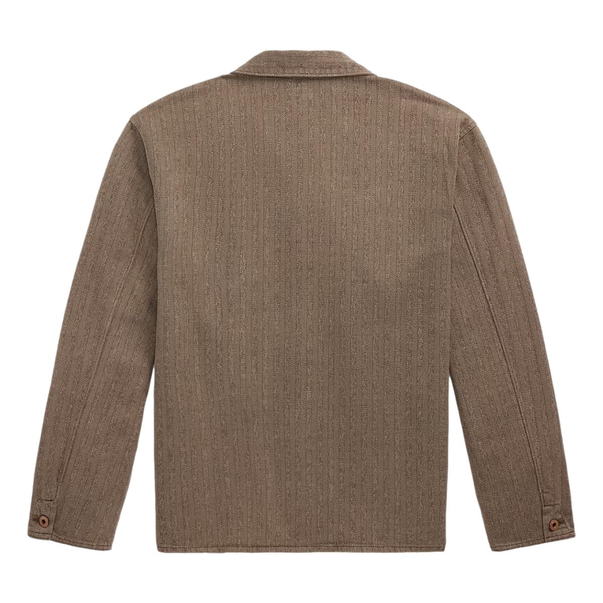 Lightweight jacket made with cotton jaspé herringbone cloth. Yarn-dyed striped pattern. Vintage-inspired details including single-needle stitching. Distressed metal buttons.
